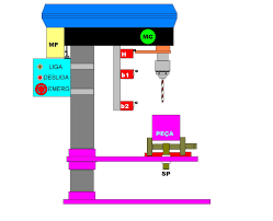 Ao pressionar o botão LIGA, se a coluna estiver na posição inicial (verificado pelo sensor “H”) e houver peça na posição de usinagem (verificado pelo sensor “SP”), e o botão “LIGA”, o processo de usinagem deve entrar em operação, acionando os seguintes dispositivos: